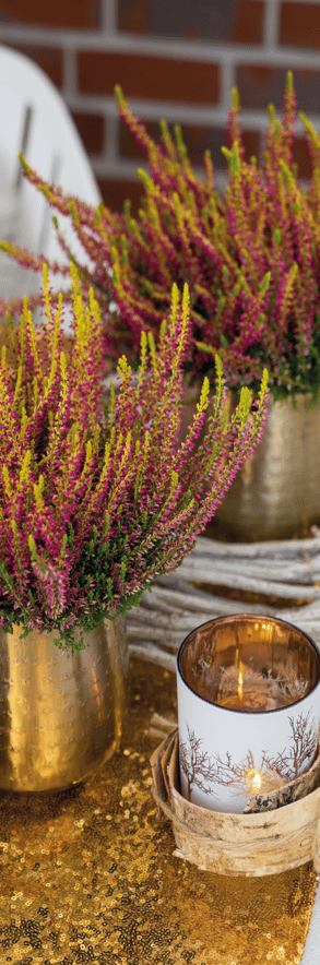 Heide wirkt in einfachen Gefäßen zwar schon für sich alleine – vor allem aber die dreifarbige `Sunset-Fire` eignet sich wunderbar für Kombinationen mit anderen Herbstschönheiten wie