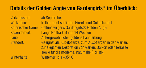 etwas von der Golden Angie haben möchte, kann sie auch in den Garten, auf Balkon oder Terrasse pflanzen, denn Golden Angie ist mehrjährig und winterhart.